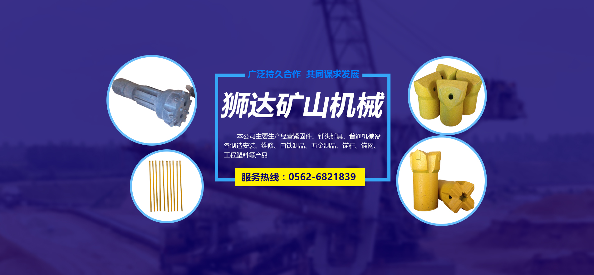 主營緊固件、釬頭釬具、普通機械設(shè)備制造安裝、維修、白鐵制品、五金制品、錨桿、錨網(wǎng)、工程塑料等
